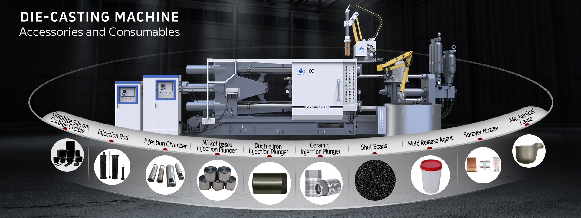 máy đúc hua dài được áp dụng để sản xuất phụ tùng ô tô và xe máy (khối xi lanh động cơ, đầu xi lanh, trục khuỷu, nắp cửa bản lề, chảo dầu, vỏ hộp số, nắp đầu hộp số, bảng điều khiển, vv), tay vịn thang cuốn điện , máy móc công nghiệp / đường bộ / đườ...